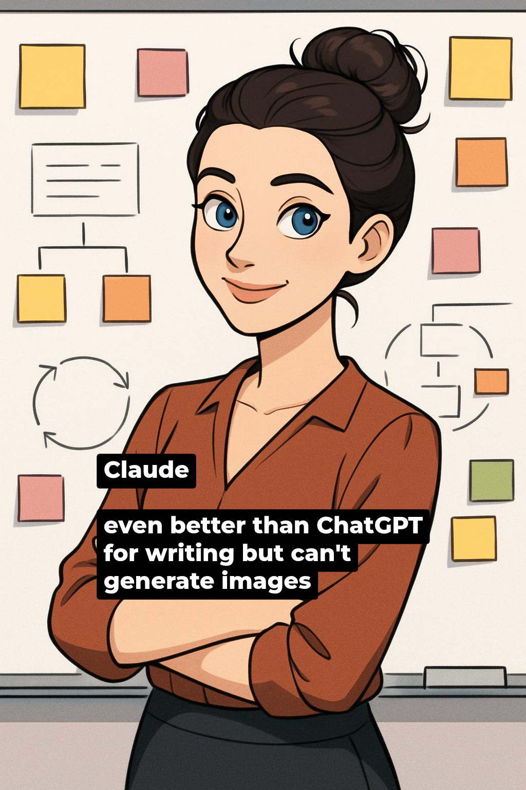 The same woman with blue eyes and dark hair in a messy bun, wearing a nice blouse, standing in front of a large whiteboard covered in colorful sticky notes and diagrams.