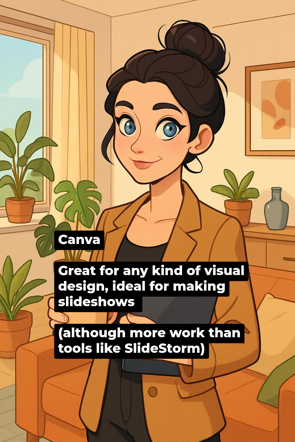 Canva Great for any kind of visual design, ideal for making slideshows (although more work than tools like SlideStorm)
